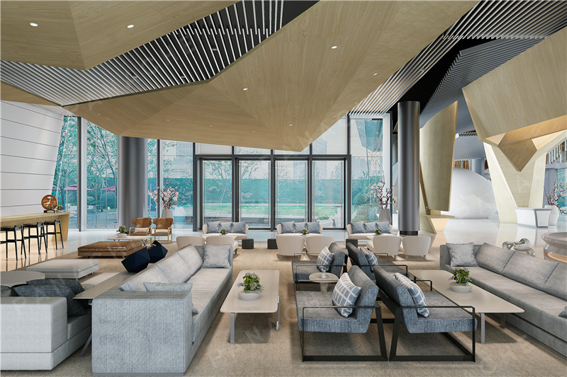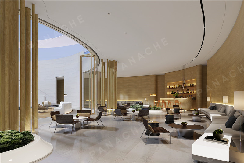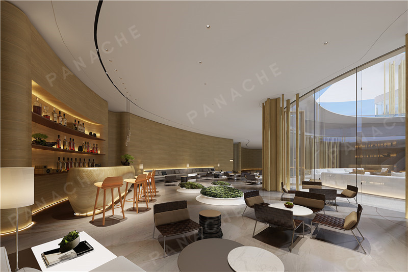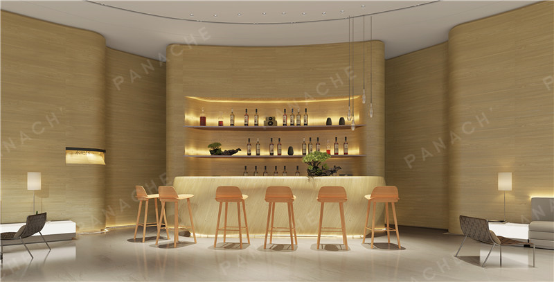 墻面采用大量的啞光淺楓木品擇金屬木飾面加以暖色的燈光效果,勾勒出了空間的雅凈氛圍令人們在高節(jié)奏的現(xiàn)代社會生活中具有協(xié)調心理平衡的作用?;⌒蔚陌膳_,體現(xiàn)了最樸素的藝術。一波三折的天花造型打破了空間的寧靜,碰撞帶來的視覺美感豐富了空間的層次。越簡單的設計,越需要極致的藝術。