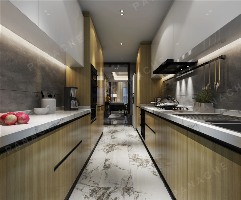 灰色調(diào)的用餐區(qū),與晶藍(lán)國畫硬包點(diǎn)綴;視覺幽深,有撲面而來的高雅感。廚房空間與餐廳通過走道相連,略顯幽靜,簡(jiǎn)潔對(duì)稱突顯沉穩(wěn),功能的分區(qū)和布局又透著絲絲嚴(yán)謹(jǐn)。