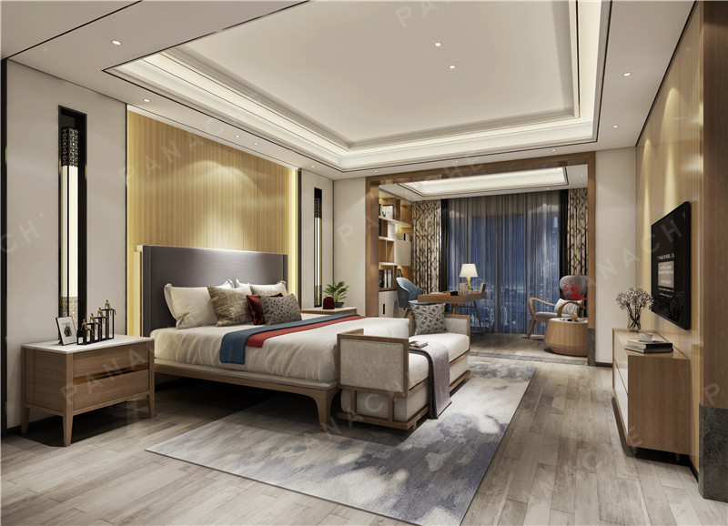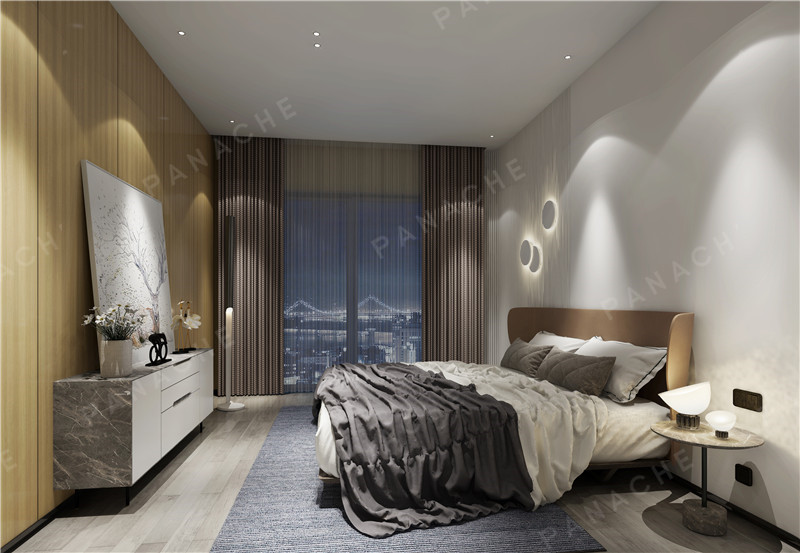 主臥室品擇金屬木飾面-木紋系列背景搭配原木家具,接近自然,將當(dāng)代文化與審美結(jié)合傳統(tǒng),提煉中式元素并加以簡(jiǎn)化和豐富,讓空間變得更為簡(jiǎn)潔秀麗,用空間的語言來表達(dá)文化內(nèi)涵。次臥空間純度與明度相結(jié)合,打破束縛,使整個(gè)更顯淡然悠遠(yuǎn)、沉穩(wěn)儒雅。