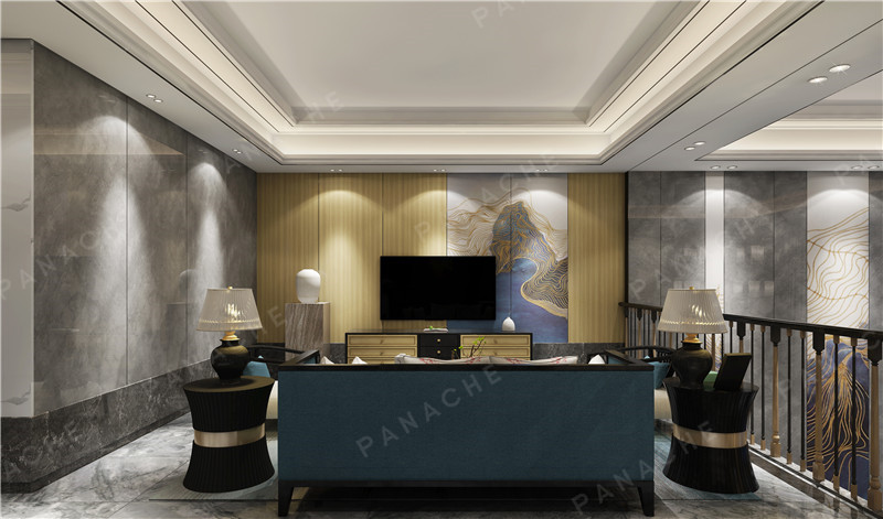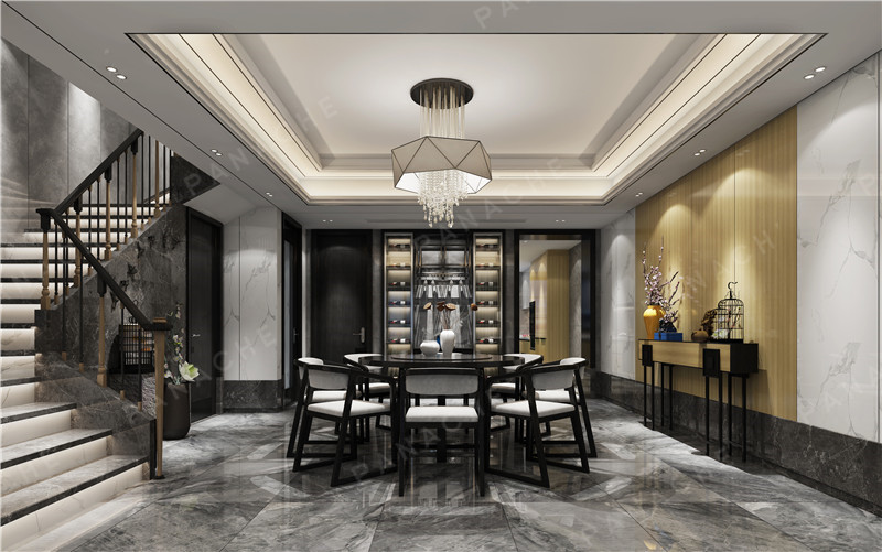 首層開間長達(dá)10米的大橫廳,將客餐廳連為一體,同時(shí)打破自然與建筑的隔閡,增加采光面和觀景面, 營造出空間感絕佳的居室空間。亙古不變的大理石背景與定制國畫硬包、藝術(shù)鋁墻板的搭配,隨著空間的穿梭,時(shí)光的變化,娓娓道來東方獨(dú)有的氣韻。