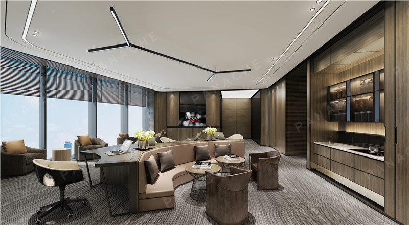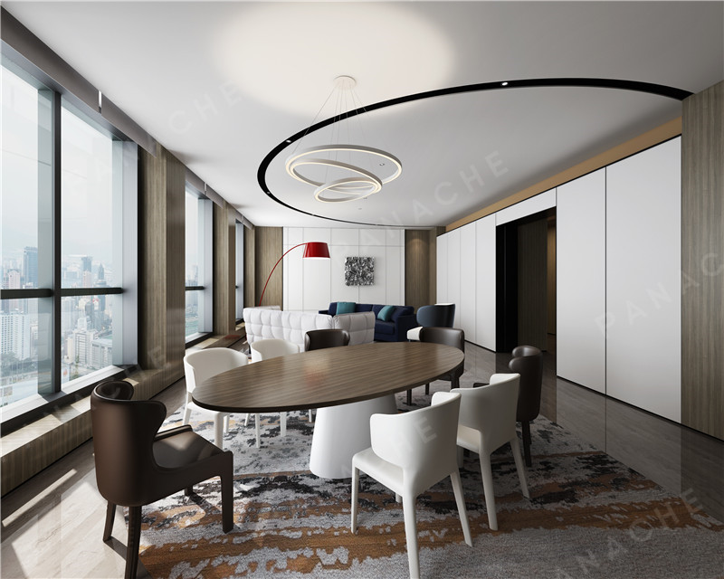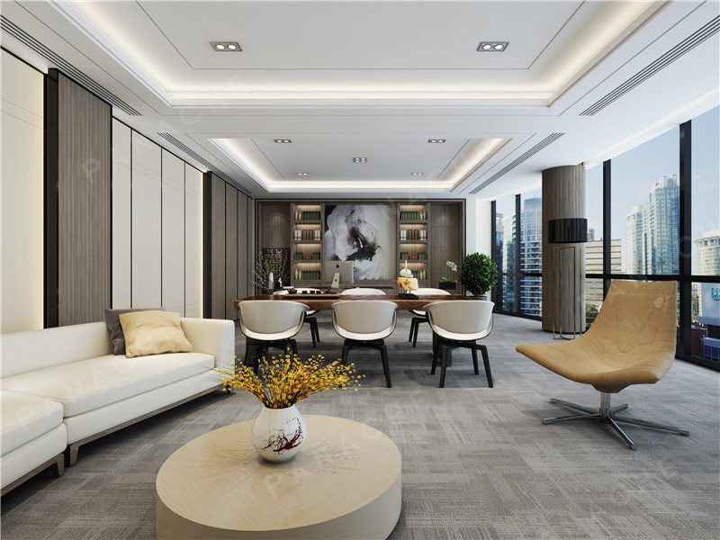 辦公桌的開放式的設(shè)計(jì),既方便商務(wù)洽談相互間無障礙的溝通交流,又給人明朗開闊的視覺感受。品擇金屬木飾面裝飾書柜,則充分利用了空間,擺放著大量的書籍和飾品,增添了幾許書香雅韻,更顯空間豐富性。正方形的天花吊頂設(shè)計(jì),既有凹面的視感,又有凸面的設(shè)計(jì)效果,十分巧妙。香檳金色金屬木飾面間隔在每一個(gè)立面整體給人簡約明凈的感覺。室內(nèi)整體搭配純白光燈光設(shè)計(jì)元素,層次感分明讓人有渾然一體的舒適之感。