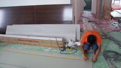 (2)放線定位:按照設計圖在基層上彈線,進行分快預排。如發(fā)現(xiàn)設計圖與現(xiàn)場實際尺寸有出入,應進行調整,調整后應經設計確認。